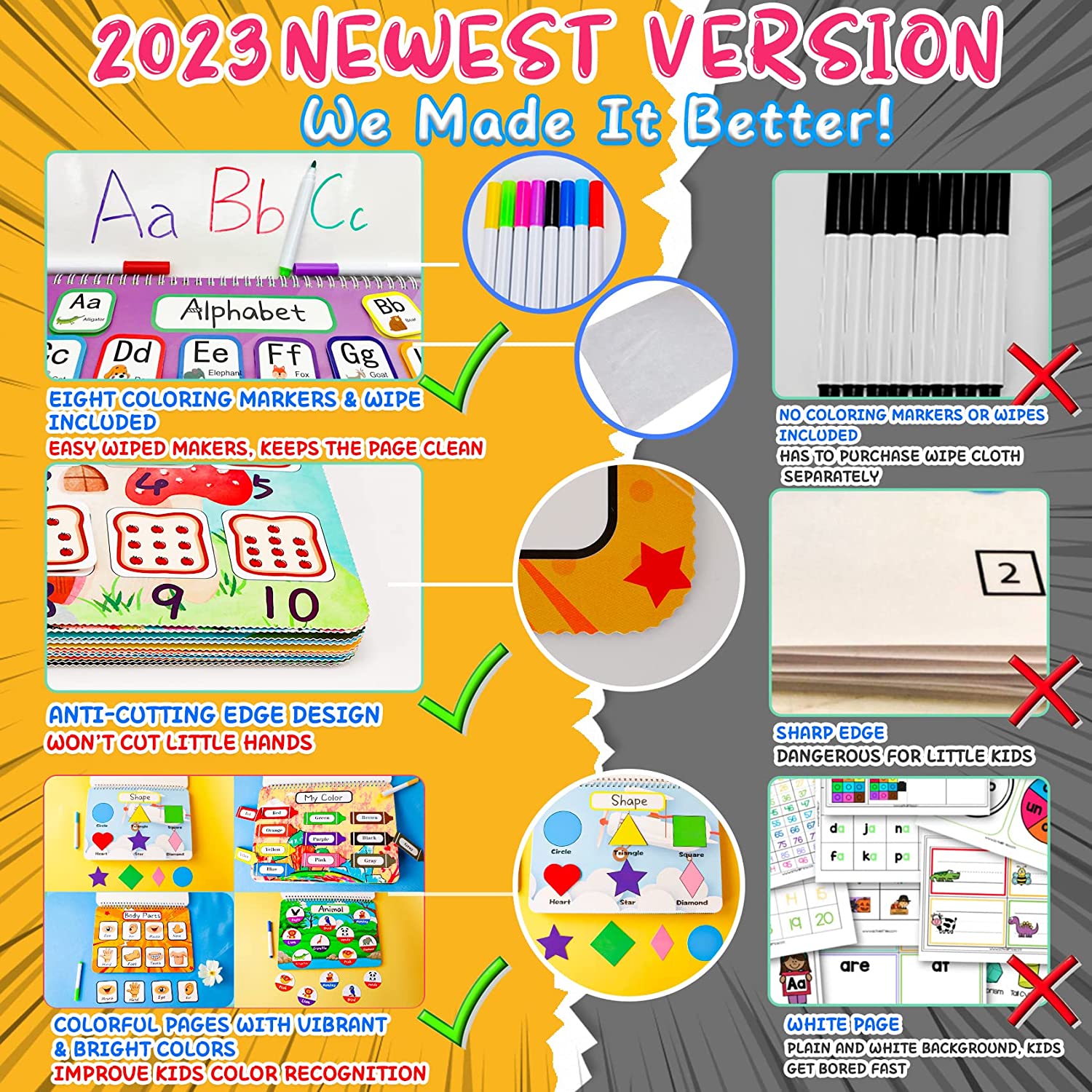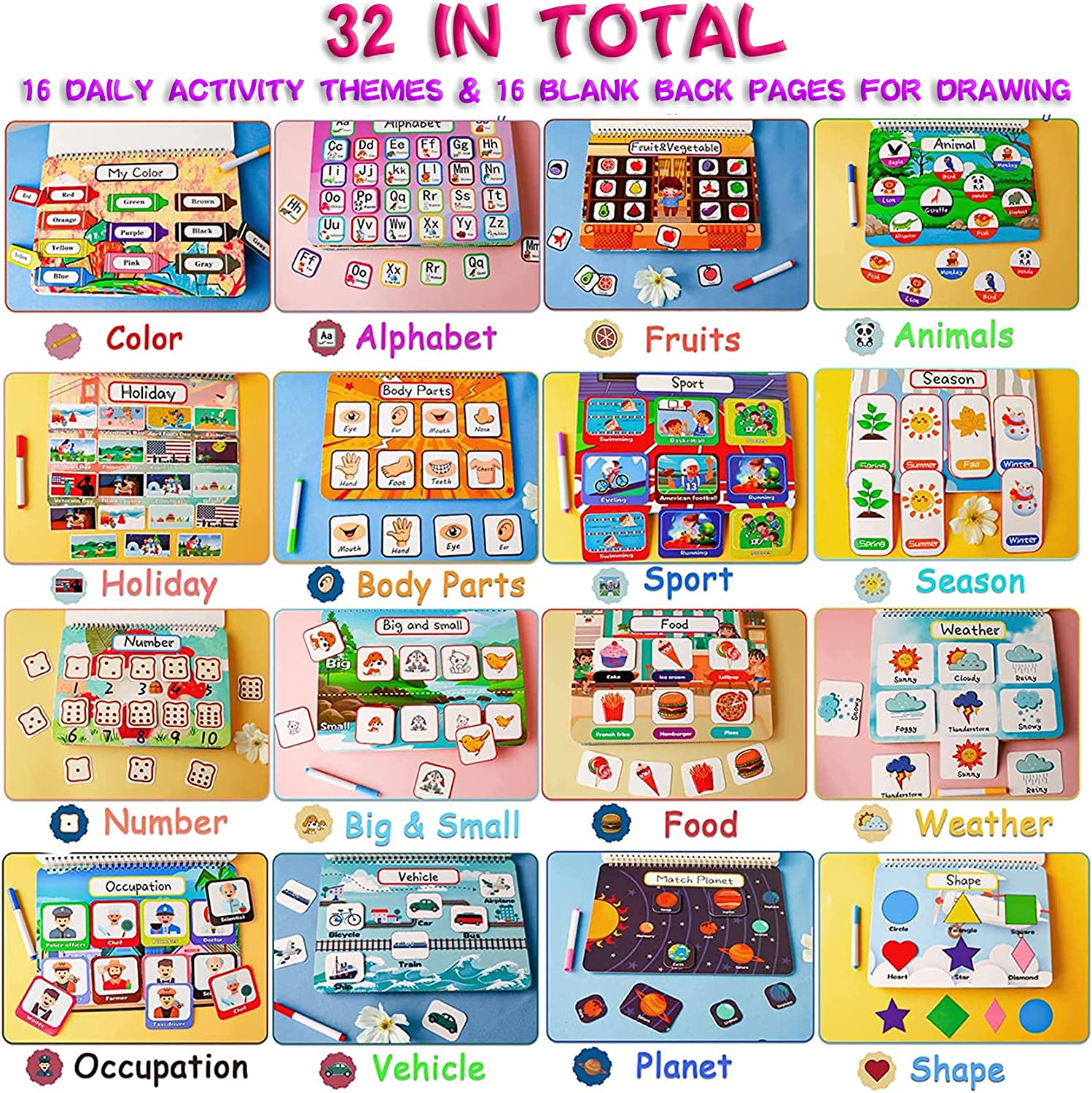 • 【MEGA PACK WITH COLOR PENS】Value pack now comes with color pens, the toy includes 16 daily activity themes like colors, letters, numbers, shapes, size, holiday, and 16 blank themes on the back so kids can draw on them as well