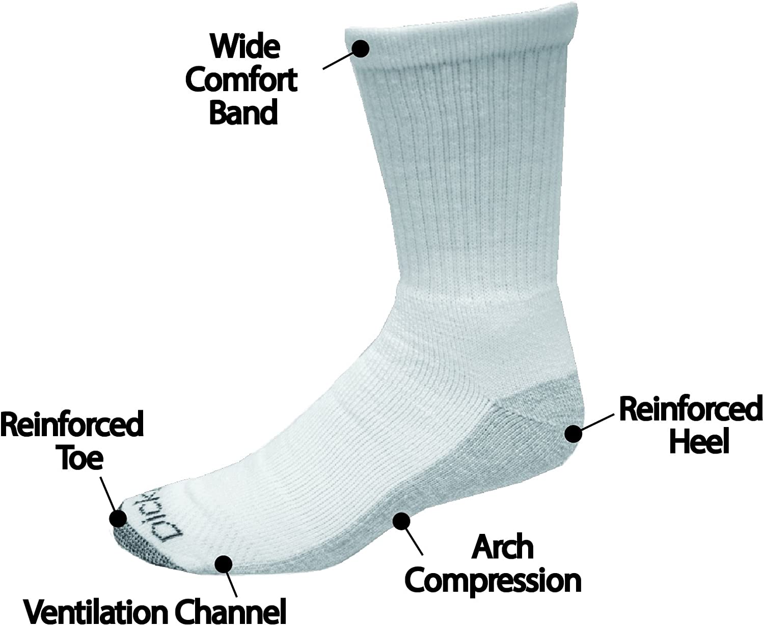 Dickies dri-tech comfort 6 pack crew with wicking, moisture management fibers keeps feet dry, ventilation channels engineered for air circulation and moisture control, arch compression hugs feet and keeps Socks in place, while providing in-step support, Reciprocated heel and toe for superior fit and full cushion comfort