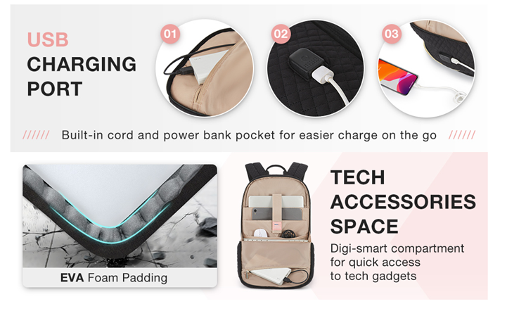 - USB Charging Port: With an inside charging cable and an outside USB port, the backpack offers an easy way to charge your devices. No need to keep power bank on the hand while walking or cycling. Also offers easy access to earphone usage