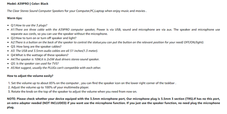• Volume controls at Ease: Volume knob on the top of the A39PRO PC Speaker,not in the line as other speakers, you can control for instant adjustments at ease.