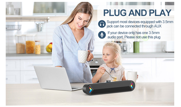 • Stereo and Noiseless:The PC speaker uses upgraded 2x5W technology to deliver the clear and crystal sound .The soundbar speaker can enhance your listening experience when you enjoying indoor movies, videos, music and games.