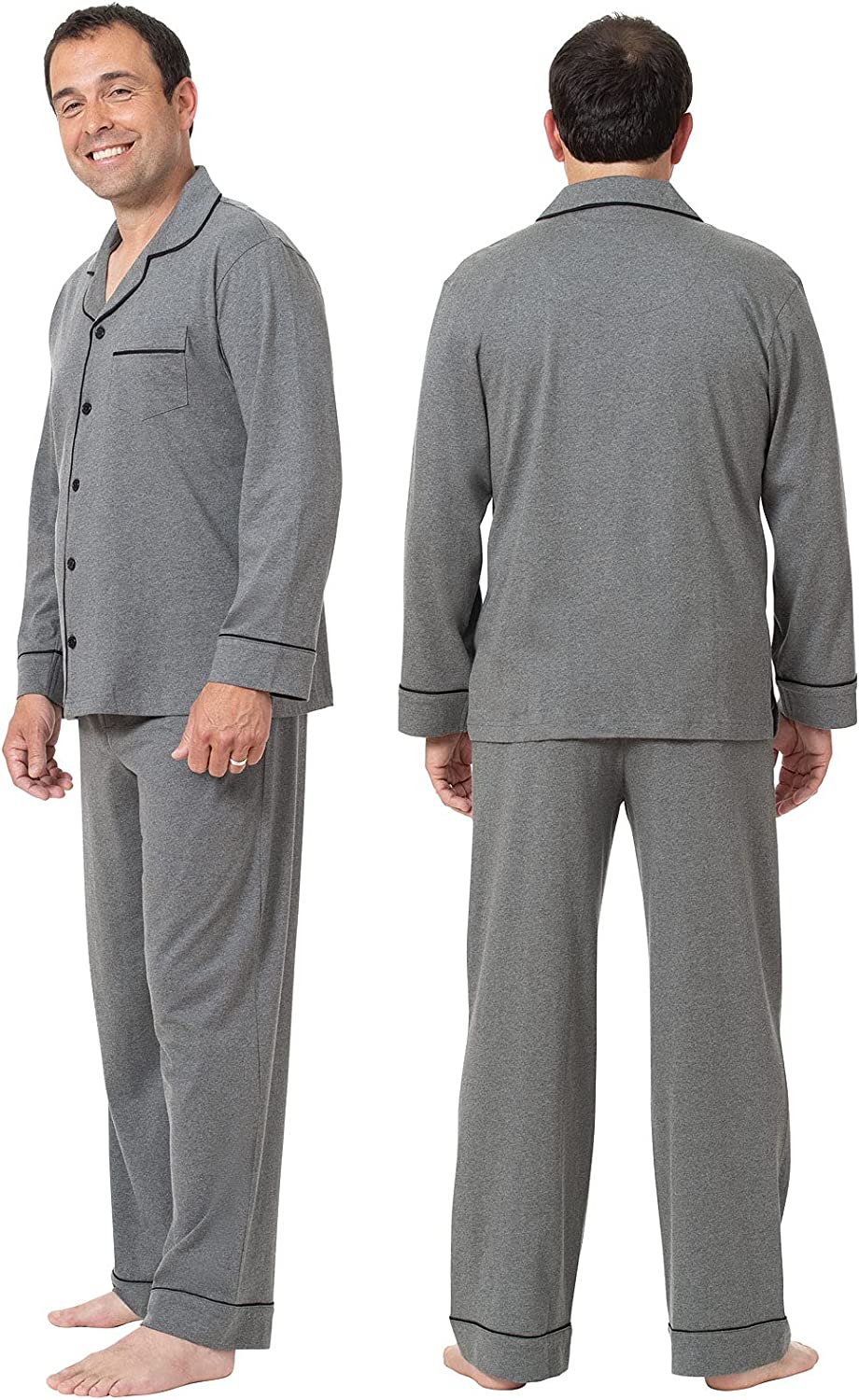 • Traditional Button-Up Style - Comfy mens pajama set features a button-up top with a notched collar and chest pocket for the timeless appeal of dress shirt styles; pants feature side pockets; contrast jersey piping adds a classic look to these two-piece pjs that men love.