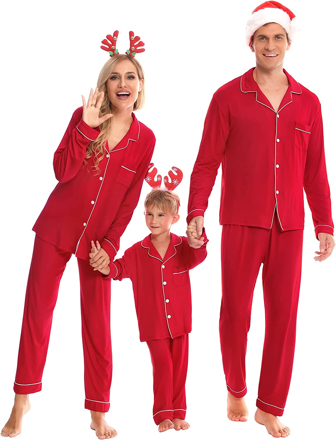 • BUTTON-FRONT PAJAMAS SETS - Classic Matching Family Xmas PJs come in the popular warm style,each christmas pajama included 2-pieces of pajamas,which feature a convenient long-sleeve top with a notched collar,button-up closure,and a chest pocket,contrasting piping for a modern take on a PJ classic; Full-length pants fit perfectly with an elastic waistband, keeping you comfy without being too tight