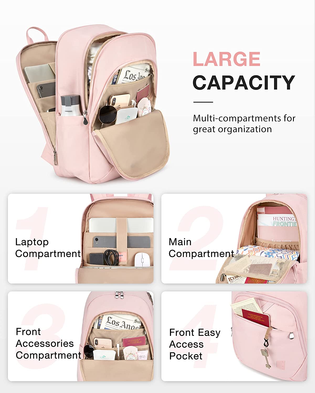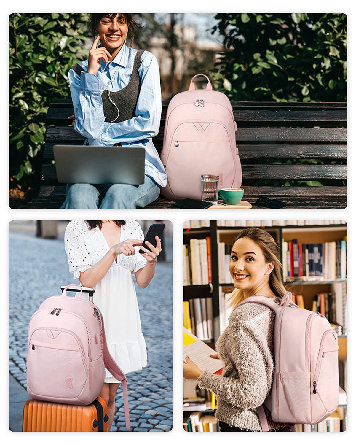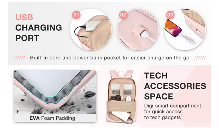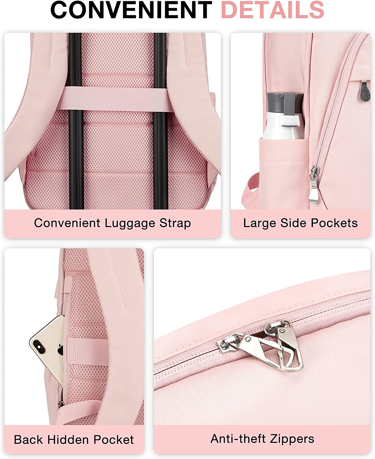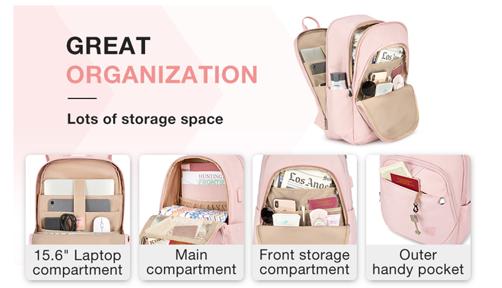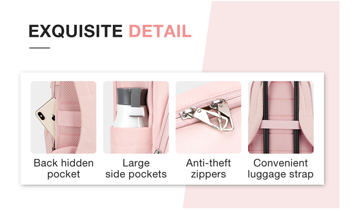 • Convenient Pocket: The front zippered pocket of the pink laptop backpack allows you to put your small items in an organized manner. With a hidden anti theft pocket on the back, protect your valuable items from thieves. Side pockets for water bottles or umbrellas make your items organized and easier to find