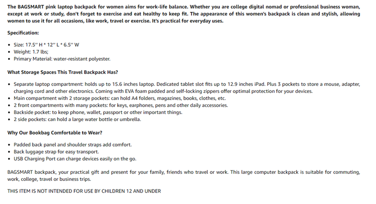 • Long-lasting Durability: BAGSMART bookbag for women is really brings out the best of our craftsmanship. Metal double-way zippers make opening/closing simple and fast. Many padding on the back and 2 ‘S’ curve padded shoulder straps make it comfortable to wear. The luggage strap ensures the backpack stands upright and easy to slide. Bagsmart backpack made of durable polyester fabric ensures long-lasting usage