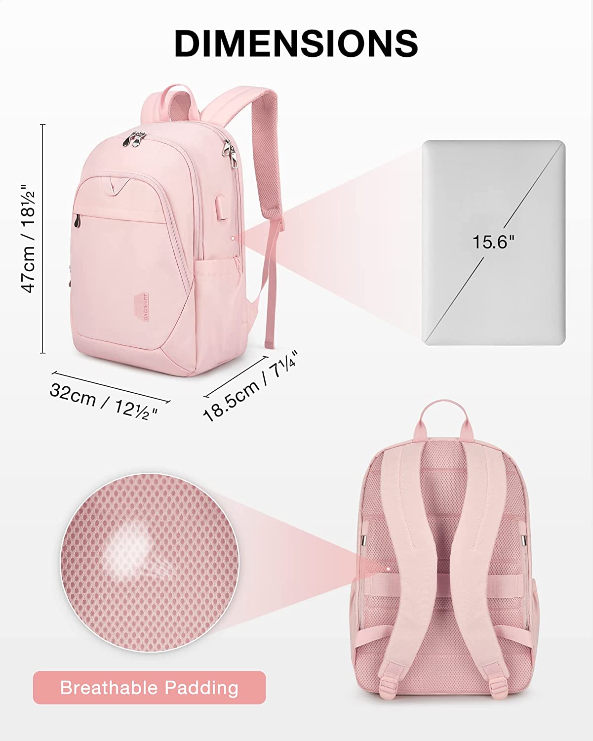• Large Capacity: Dimensions 18.5 * 12.5 * 7 inches, The laptop backpack has multiple divider pockets, The laptop compartment with anti-theft zippers is suitable for a laptop up to 15.6", padded with EVA foam and can offer optimal protection for your laptop. Tablet slot fits up to 12.9’’ iPad. Mesh pockets for mouse, adapter, and charging cord. Large main compartment room for daily necessities, such as A4 folders, textbooks, magazines, chargers, power bank and clothes