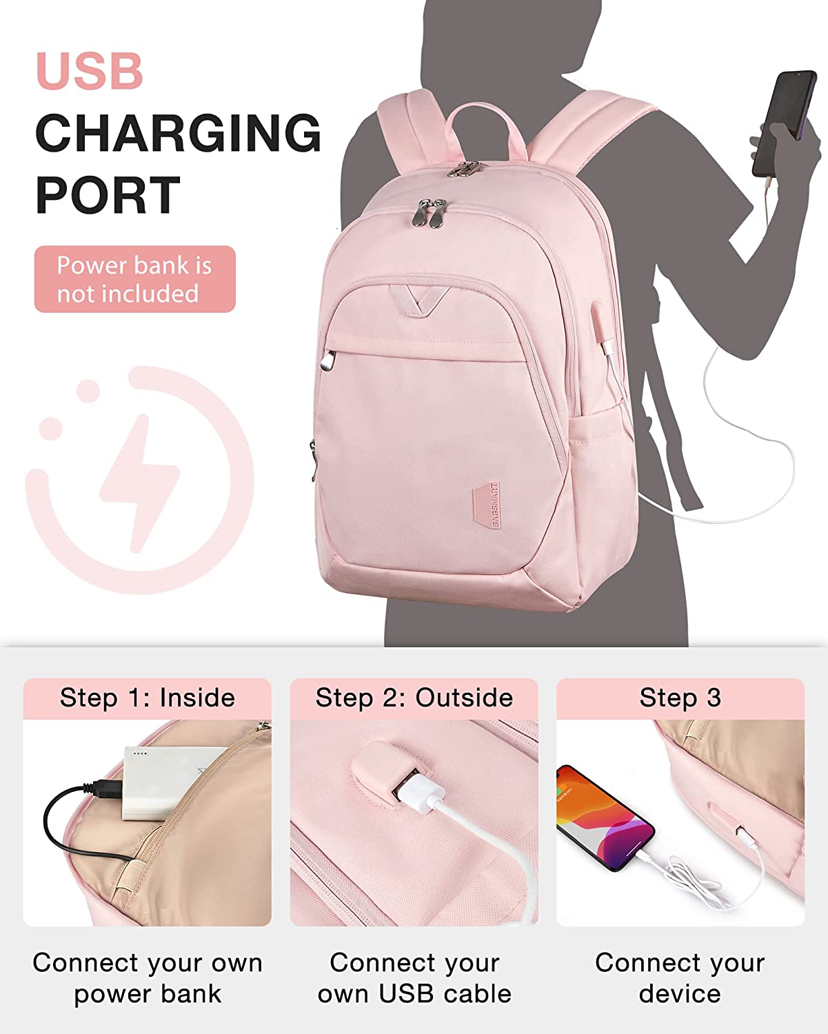 BAGSMART Travel Laptop Backpack Women, 15.6 Inch Anti Theft Laptop Backpack with USB Charging Port Water Resistant Casual Daypack College School Bookbags Computer Backpack for Work, Pink