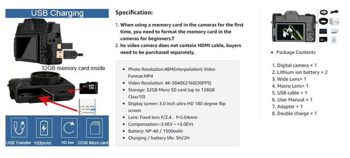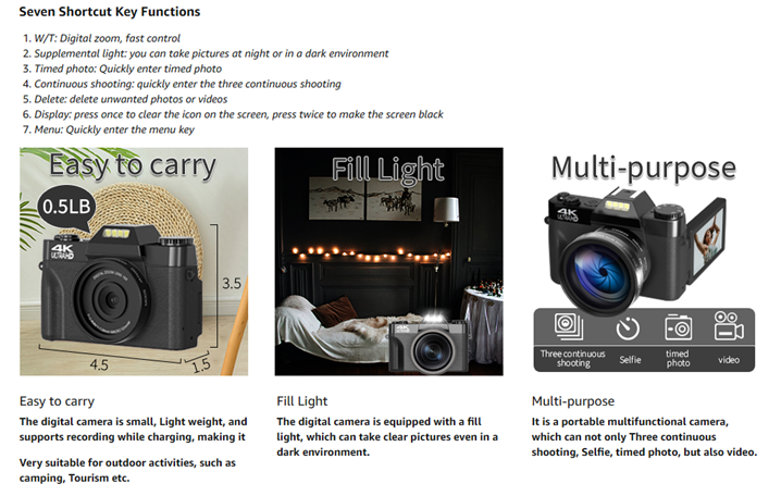 The vlogging camera supports 16x digital zoom, video pause, recording while charging, loop recording, continuous shooting, silent recording, selfie.Best for YouTube shoot lovers