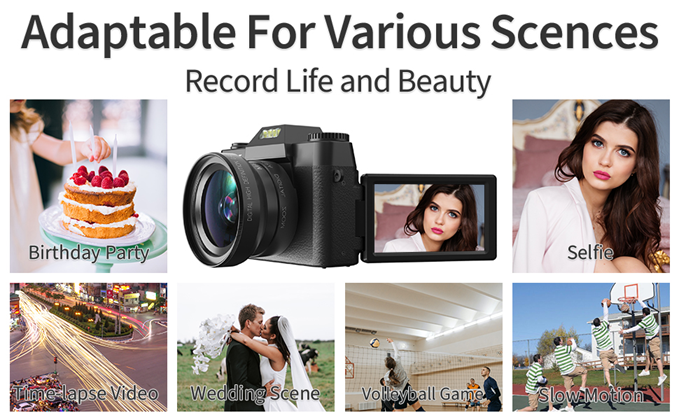 - ?【Digital Camera with Wide Angle Lens & Macro Lens】Equipped with a detachable 52mm wide angle lens and macro lens, this 4K camera captures wide horizons and tiny details with ease. Manual focus guarantees sharp photos, while a top knob allows for easy switching between photo, video, and time-lapse photography modes.