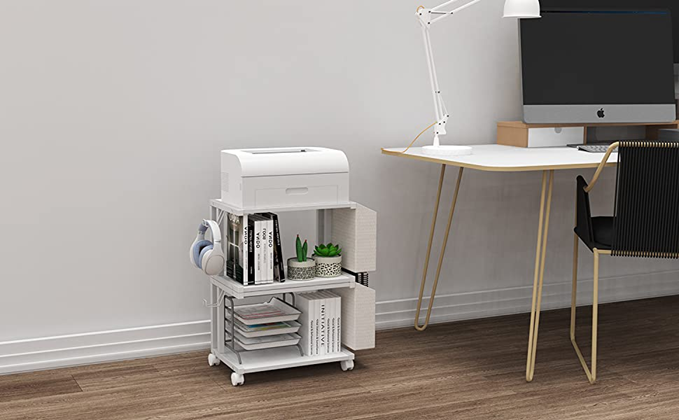 - 【MULTI-PURPOSE 2 TIER MOBILE SHELF】Dimensions: 17.3''/Lx11''/W’x11''/H-Ideal size for small 3D printers, fax machines, scanner and other office supplies. Our multifunctional desktop printer shelf can also be used as office organization, dorm essential, book shelf, storage shelf, and so on. It can be used in home, office, dorm, craft room as an ideal organizer and storage.