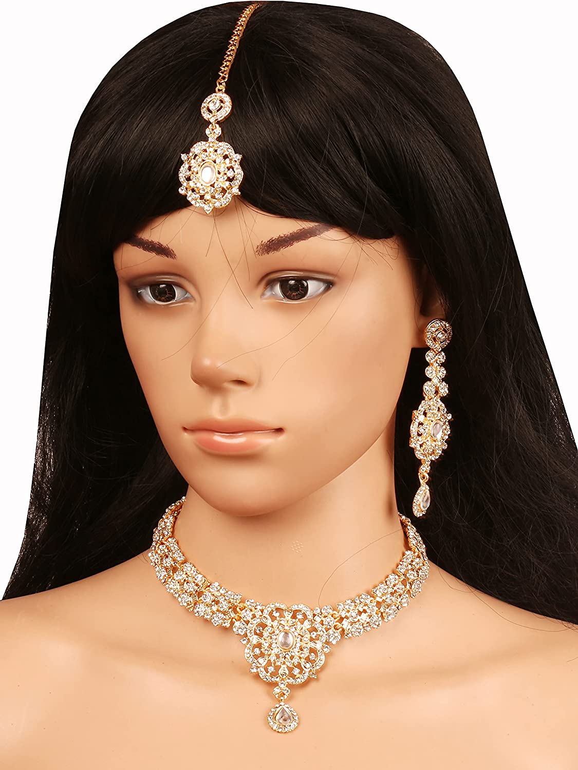 • NEW! Touchstone Indian Bollywood Contemporary Fabulous Style Definition Rhinestone Designer Jewelry Wedding Necklace Set In Gold Tone For Women. EXTRA LONG EARRINGS: Length 3.50 Inches. SPECIFICATIONS: Necklace Length 14 Inches. Extendable/Adjustable With Extra Links/Chain Up To 9.2 Inches. Earring Weight (Single) 15 Gms. Earring Length 3.5 Inches. Earring Width 1.1 Inch. Mang Tika Length 6.4 This is in a special dark gold plating to recreate the look of antique jewelry.