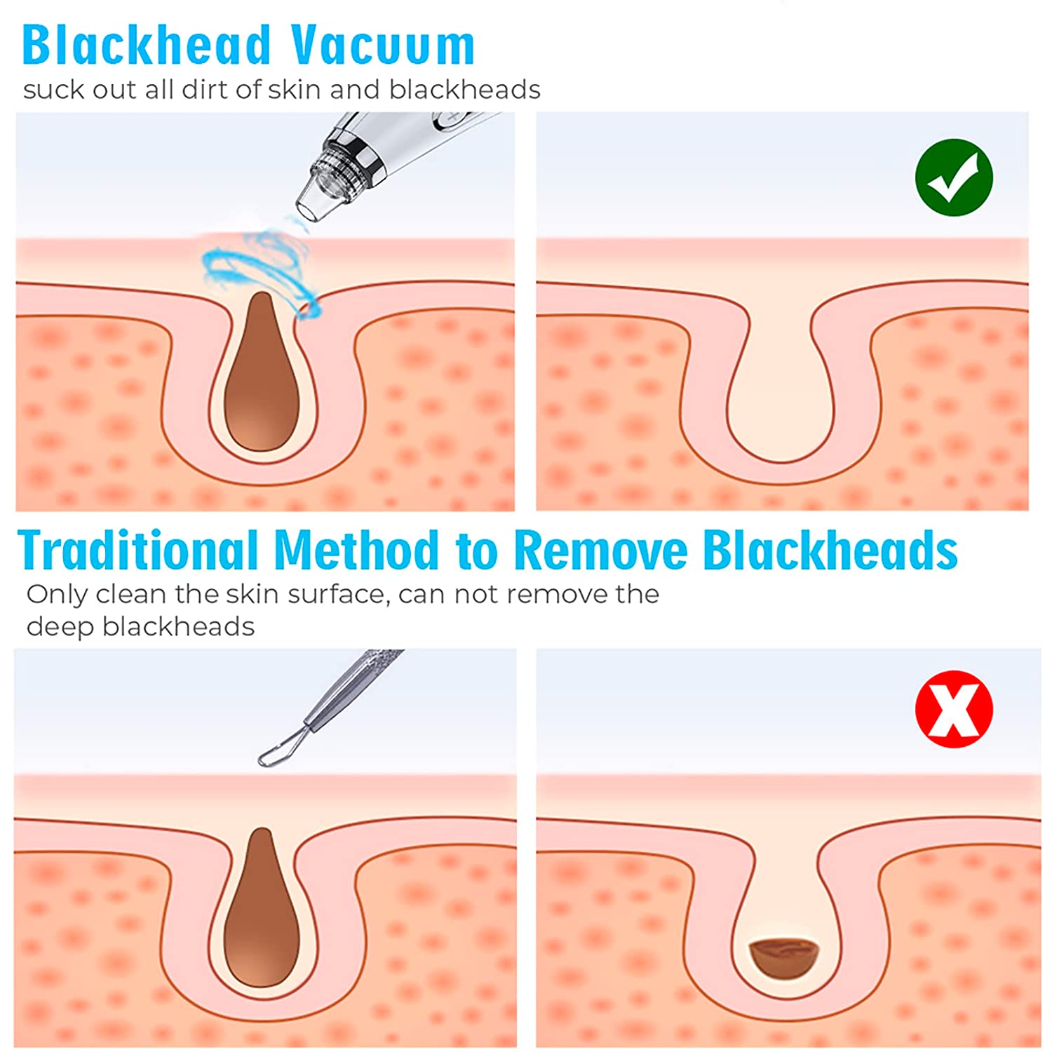 • ? Newest Technology Blackhead Vacuum – Super powerful pore vacuum can be safely used on the face directly achieve deep cleaning and effectively remove blackheads, whiteheads, dead skin, treat acne,grease and makeup residues.which can increase blood circulation and skin elasticity, lessen wrinkle, shrink pores, smooth fine lines without hurting your skin.