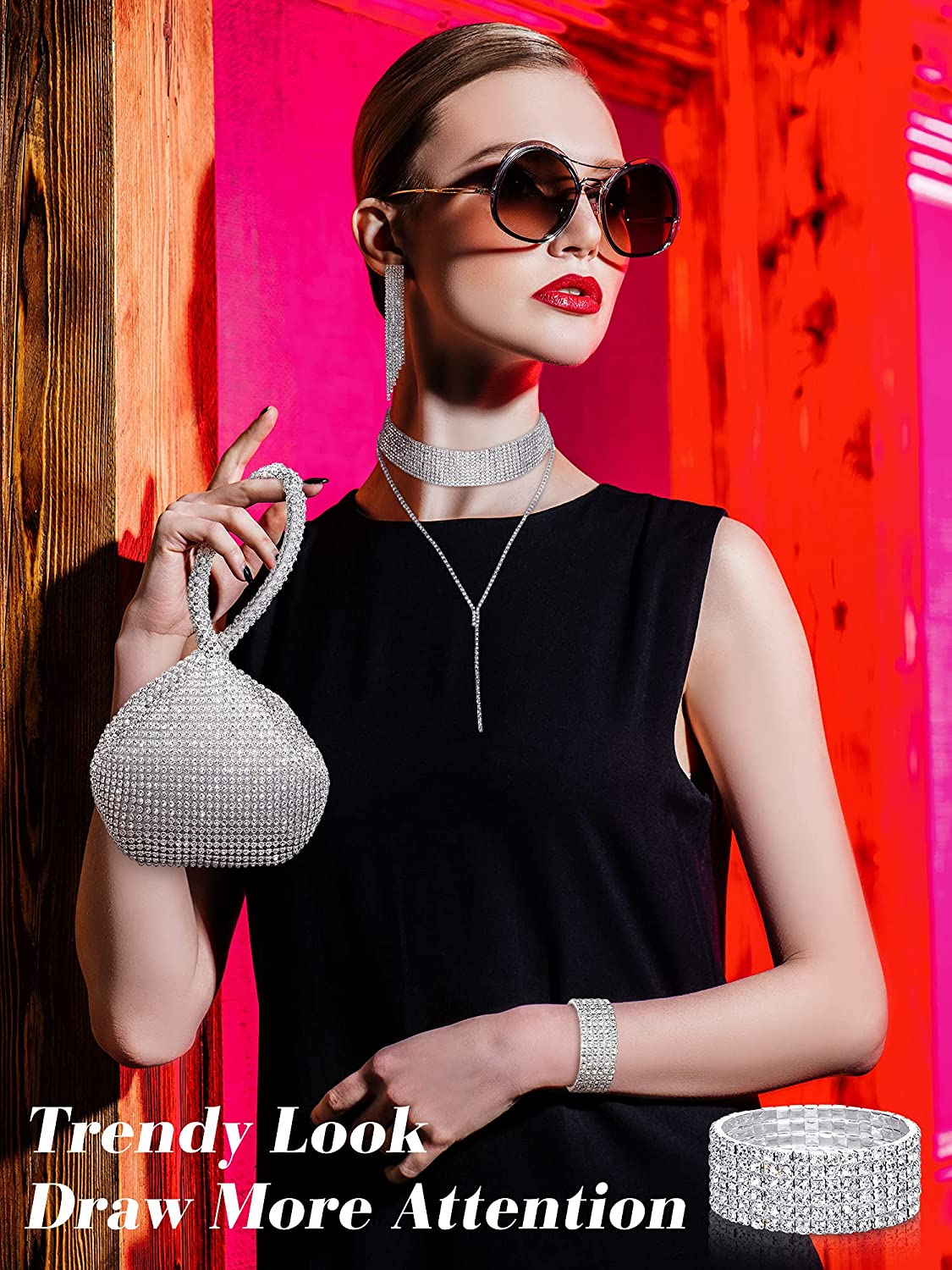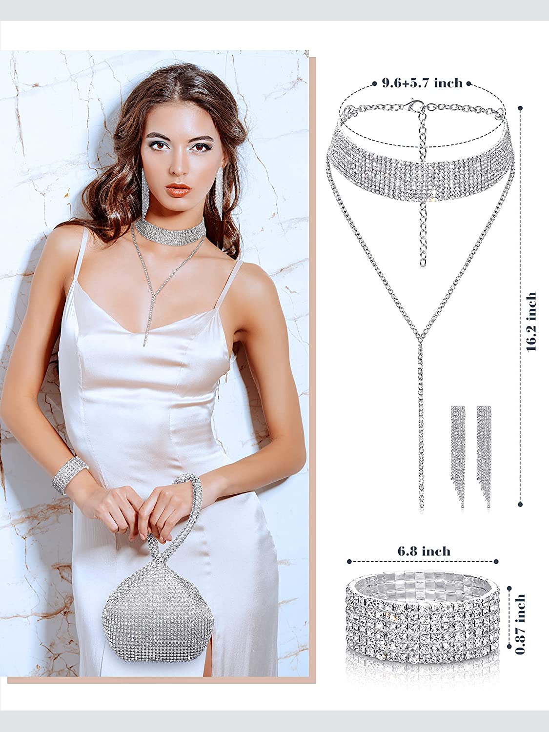 • Package content: you will receive 1 piece of crystal rhinestone choker necklace, 1 piece of stretch bangle bracelet, 1 pair of crystal dangle fringe earrings and 1 piece of rhinestone evening bag, which are ideal accessories for most women