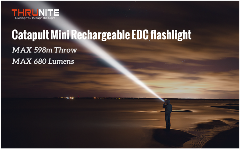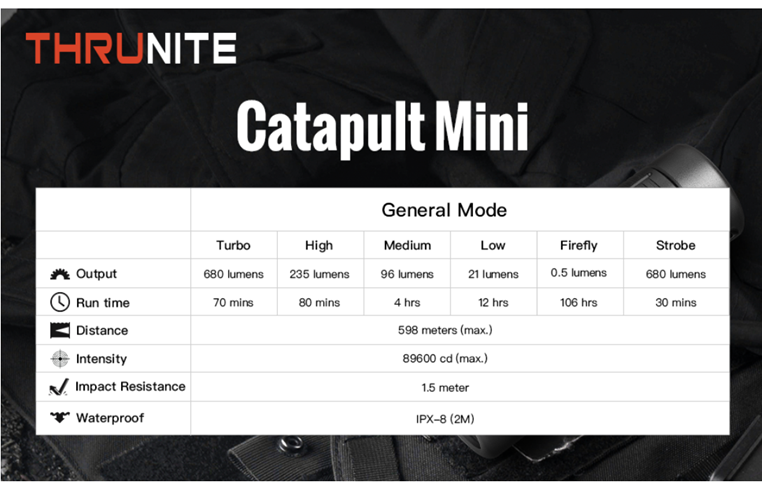 Catapult Mini uses a rechargeable lithium battery and utilizes an improved OSRAM KW.CSLNM1.TG LED, producing a maximum of 680 lumens for up to 653 yards/598 meters of throw.