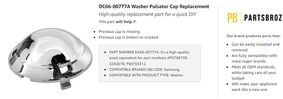 • Quick DIY repair - DC66-00777A Replacement Pulsator Cap will help if your previous cap is missing, broken, or cracked. Make sure to disconnect your appliance before starting the repair process.