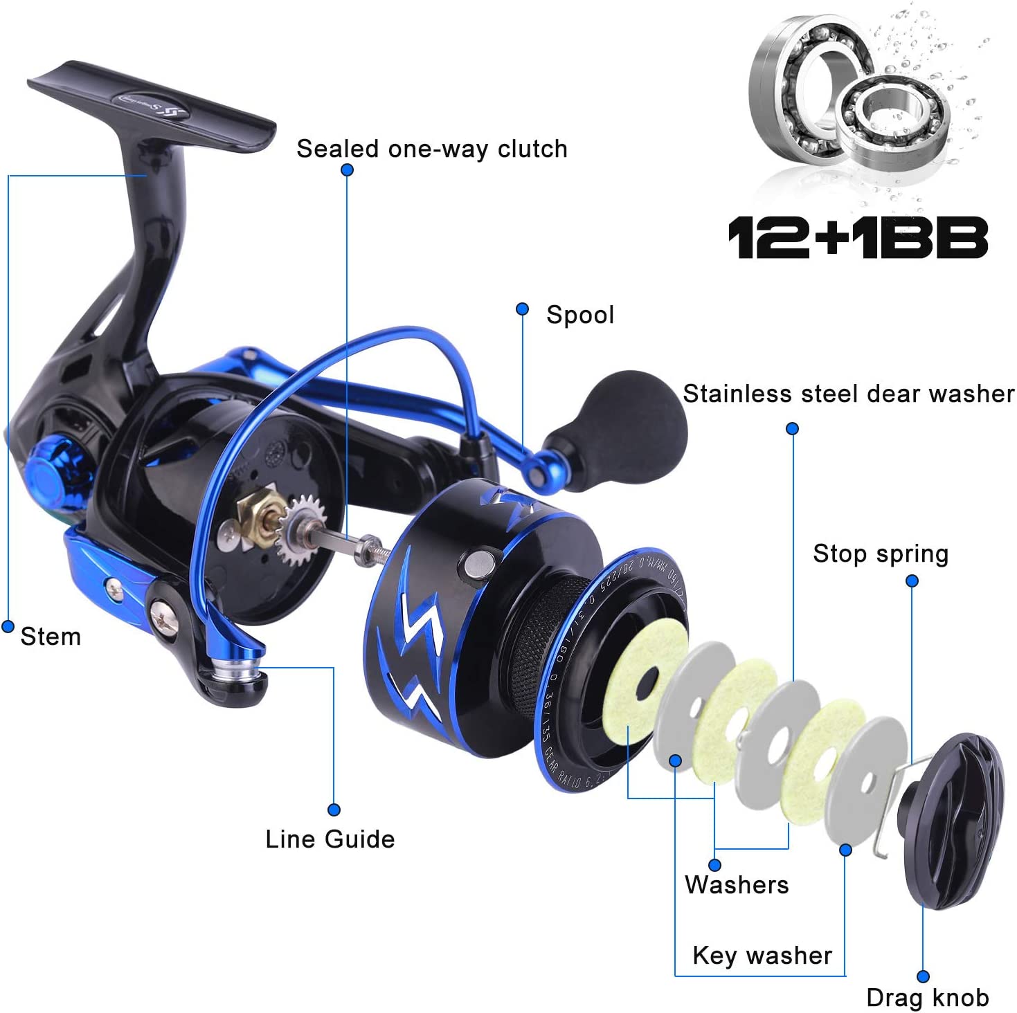 - Smooth Performance:12 high-quality ball bearings and an instant stop unidirectional anti-reverse bearing make it have super smooth performance.The Sougayilang spinning reel features a lightning fast 6.2:1 gear ratio as well as a buttery smooth,the high speed retrieve helps every angler battle the strong, fast runs of the biggest fish and the moderate speed is perfect for finessing in your next trophy.