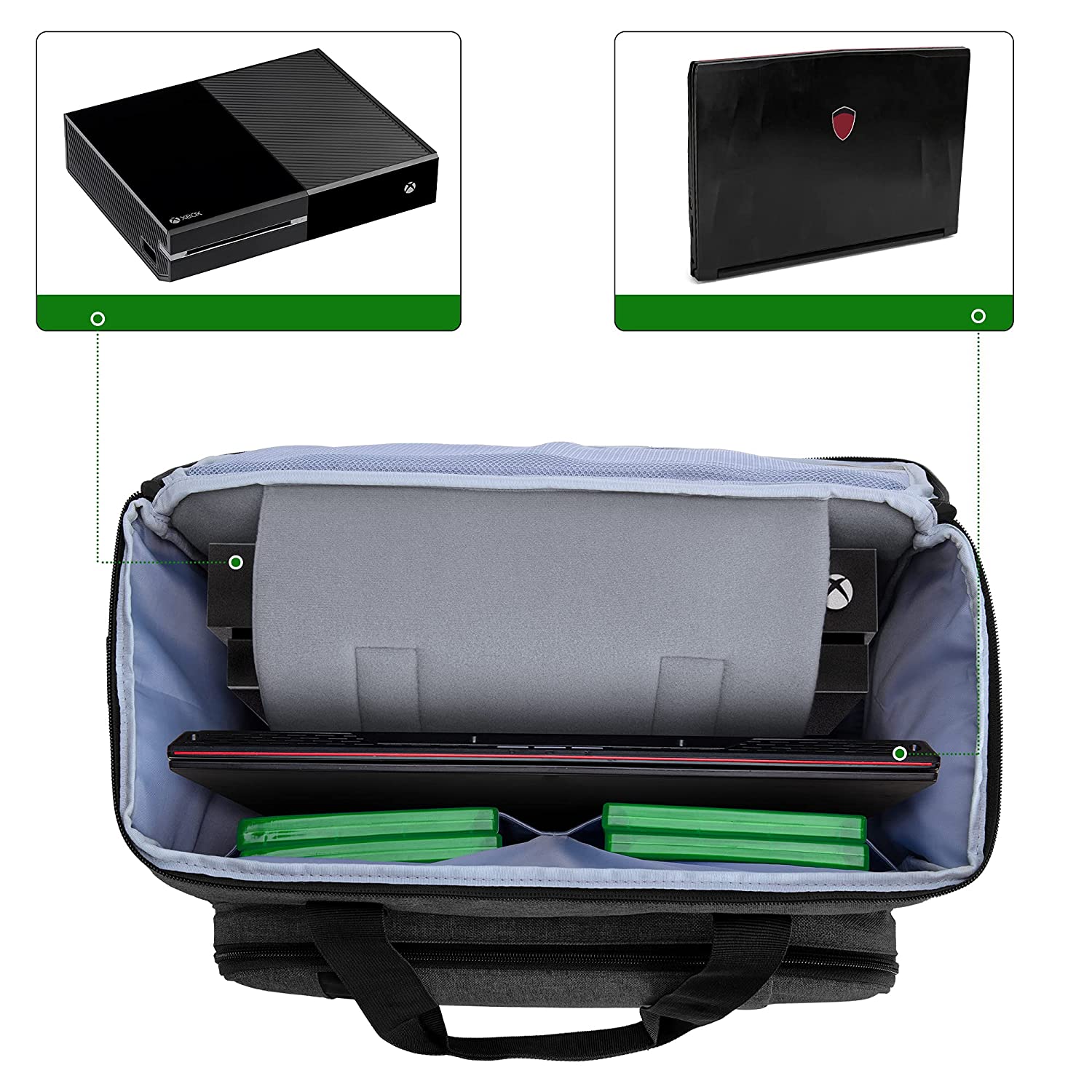 • LARGE COMPARTMENT: 15.7”x 6.7”x 11.4”. Roomy enough for your game console, extra space to store your laptop (Up to 15.6"). 2 internal pockets for accessories like, game discs, media remote, etc.