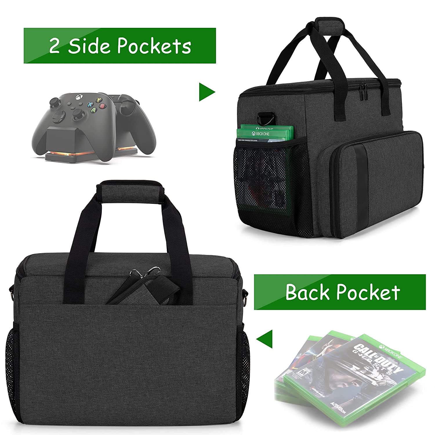 • WELL ORGANIZED: Side mesh pouches are used for storing game discs or other game accessories. Separate back layer is attached for ipad or other personal items. (Bag only, NOT includes console and accessories.)protects the equipment away from bumping and damage.