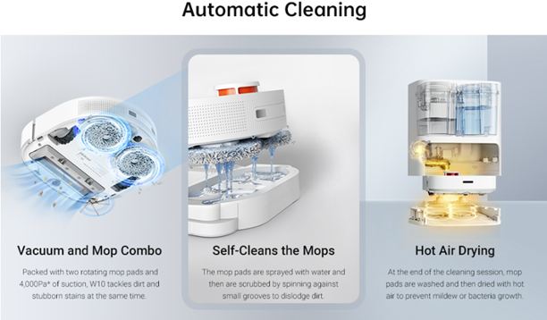 - 【Sweeping, Mopping, Washing, and Drying 4-in-1】 Intelligent return cleaning of the mop and hot air drying make your cleaning healthier and cleaner. the W10 robot vacuum is equipped with a 4L clean tank and a 4L sewage tank, no need to change the water frequently, free your hands.