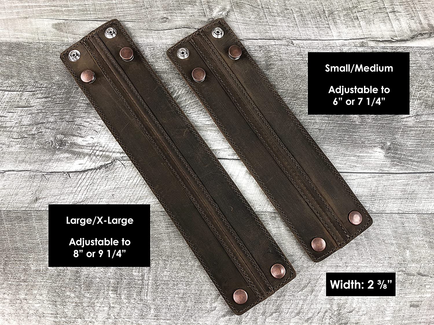 SIZE & COMFORT: This small/medium sized leather cuff bracelet adjusts to either 6” or 7 ¼” (measure your wrist size where you would wear the cuff before ordering. Most people will fit into the small/medium size). Width: 2 3/8". We go the extra distance including extra snap covers so you can have your exposed snaps covered when using the larger size setting. We also over-designed comfort with full grain pigskin leather for the inside of the cuff which is smooth and comfortable. No sticky suede!