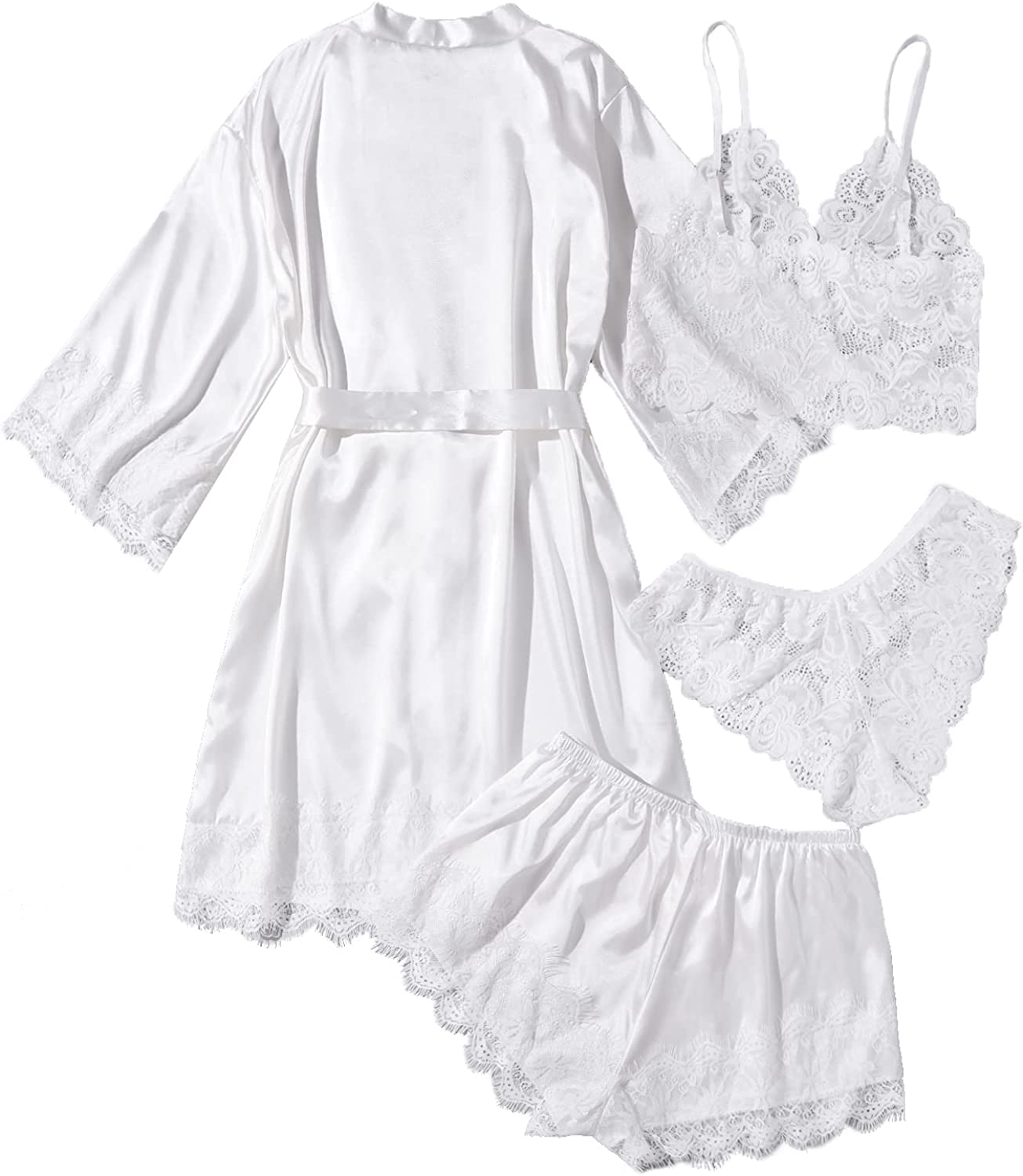SOLY HUX Women's Satin Pajama Set 4pcs Floral Lace Trim Cami Lingerie Sleepwear with Robe