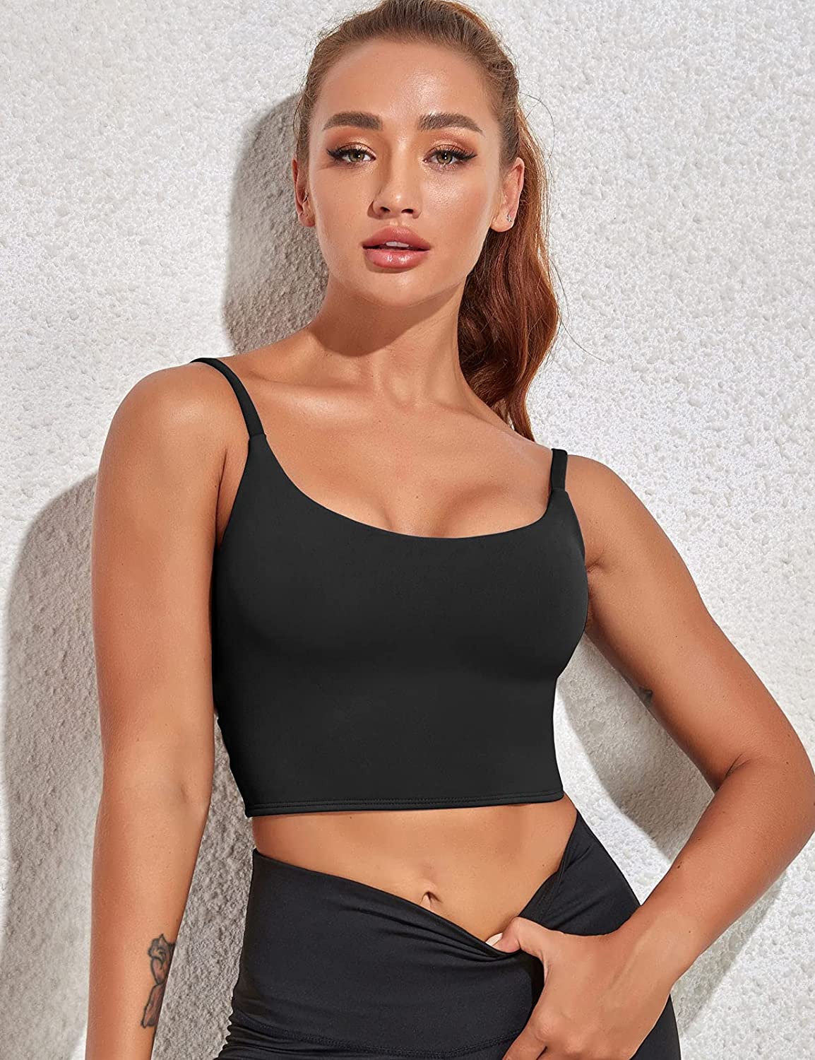 • Built in Bra Tank Tops for Women Strappy Back Sports Bra Black Crop Top. Sexy longline sports bras for women padded cropped tank top is perfect to wear with shorts and leggings for daily wear or exercise. Just enjoy your all activities with black sports bra athletic tank tops for women that perfect for your high-waist pants. Workout tank tops fitness running shirts for women that can be also as comfy sleep bra cute crop tops for women are a must-have in your wardrobe!