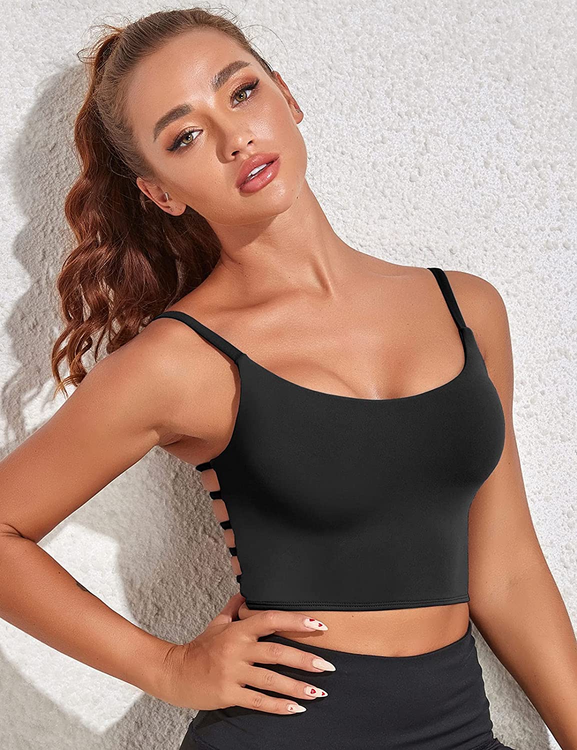 • Womens Longline Sports Bra Padded Yoga Bra Workout Crop Tank Top with Built in Bra. Featuring spaghetti straps bra and sexy hollow out back, workout long lined sports bra tank top helps you move with ease and make your back look beautiful by virtue of cut out backless bra. Longline sports bra cami tank top with built in bra not only give your body more room to breathe but also highlight charming figure. Cute summer tops for women yoga bra tops let you twist with ease and keep you wicking.