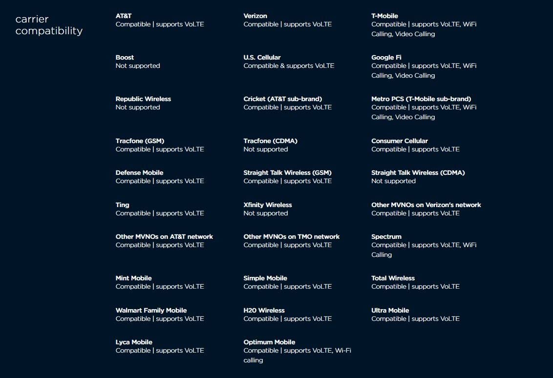 • Carrier compatibility: AT&T: VoLTE, Verizon: VoLTE, T Mobile: VoLTE, WiFi Calling, Video Calling, Tracfone: GSM, Spectrum: VoLTE, WiFi Calling. Does not support: Boost: Republic Wireless, Tracfone (CDMA), Straight Talk Wireless (CDMA), Xfinity Wireless. For all carrier compatibility details - please check the product images in detail.Form_factor : smartphone.Other camera description:Front,Rear