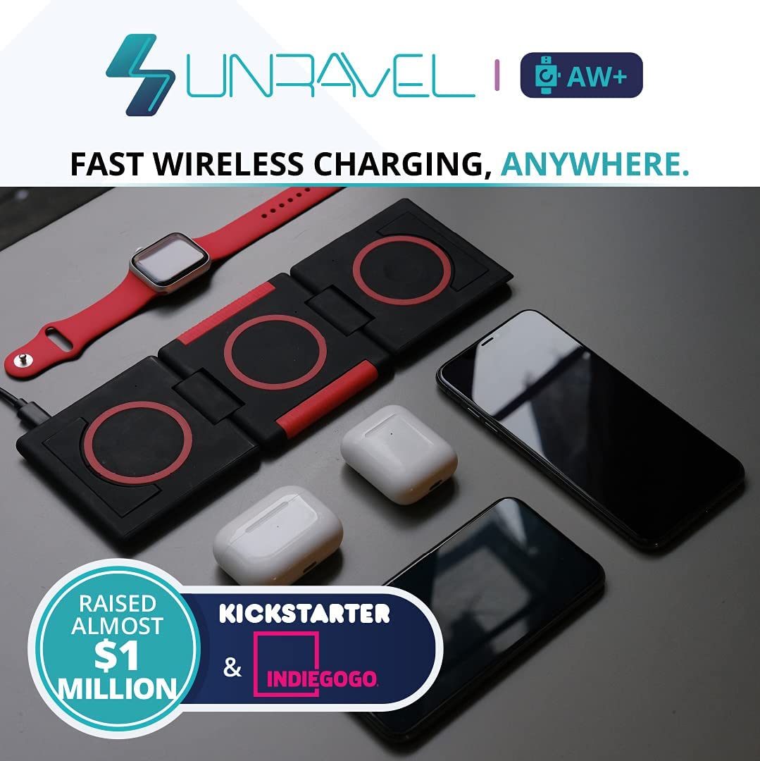 Unravel 3-in-1 Foldable Travel Wireless Charger - 7.5W Charging Station for iPhone 14, 13, 12, Pro, Pro Max, Mini, Apple Watch Ultra, SE, Series 1-8, AirPods, AirPods Pro - Black (No AC Adapter)