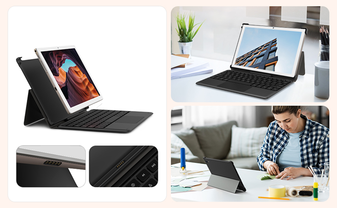 We designed a tablet with a trackpad keyboard.By mounting the 2 in 1 keybord, you can type on your tablet with greater ease anywhere and anytime.It can increase office productivity without problems.