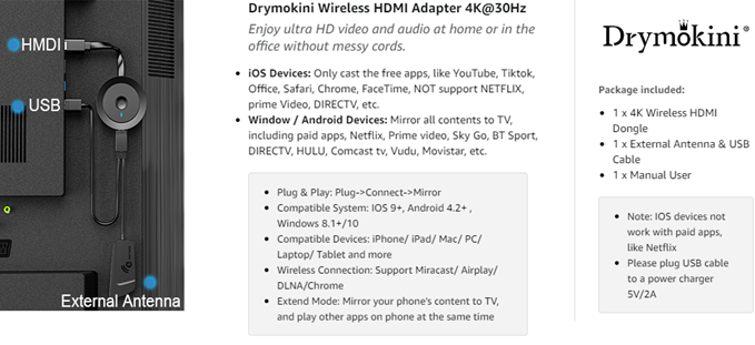 • ?【Wireless & Easy Connection】 No apps, no bluetooth needed. Get connected and casting in minutes. Simply plug external antenna to dongle, connect it into the HDMI port, power it, find mirror function. You will enjoy HD video and audio from your device to any TV. Making your HDMI wireless.