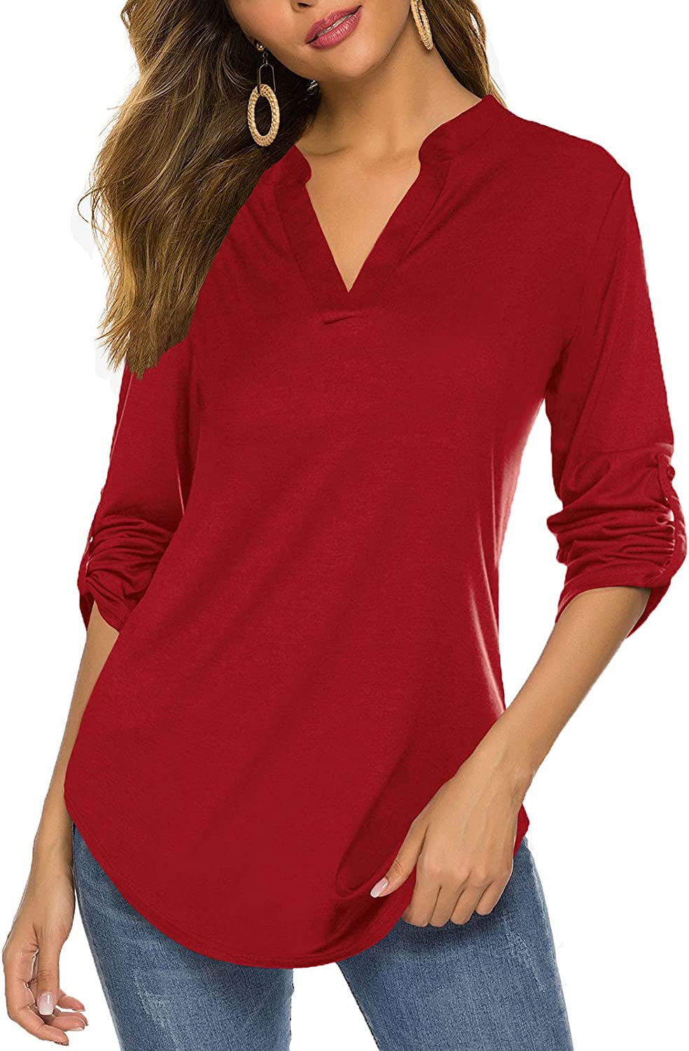 • Elegant Design, roll up 3/4 sleeve shirt, long sleeve tunic, v neck shirt, solid color, hip length, pleated flowy style. The fashionable henley shirt makes this lightweight blouse timeless fashion, which makes you both chic and classic.