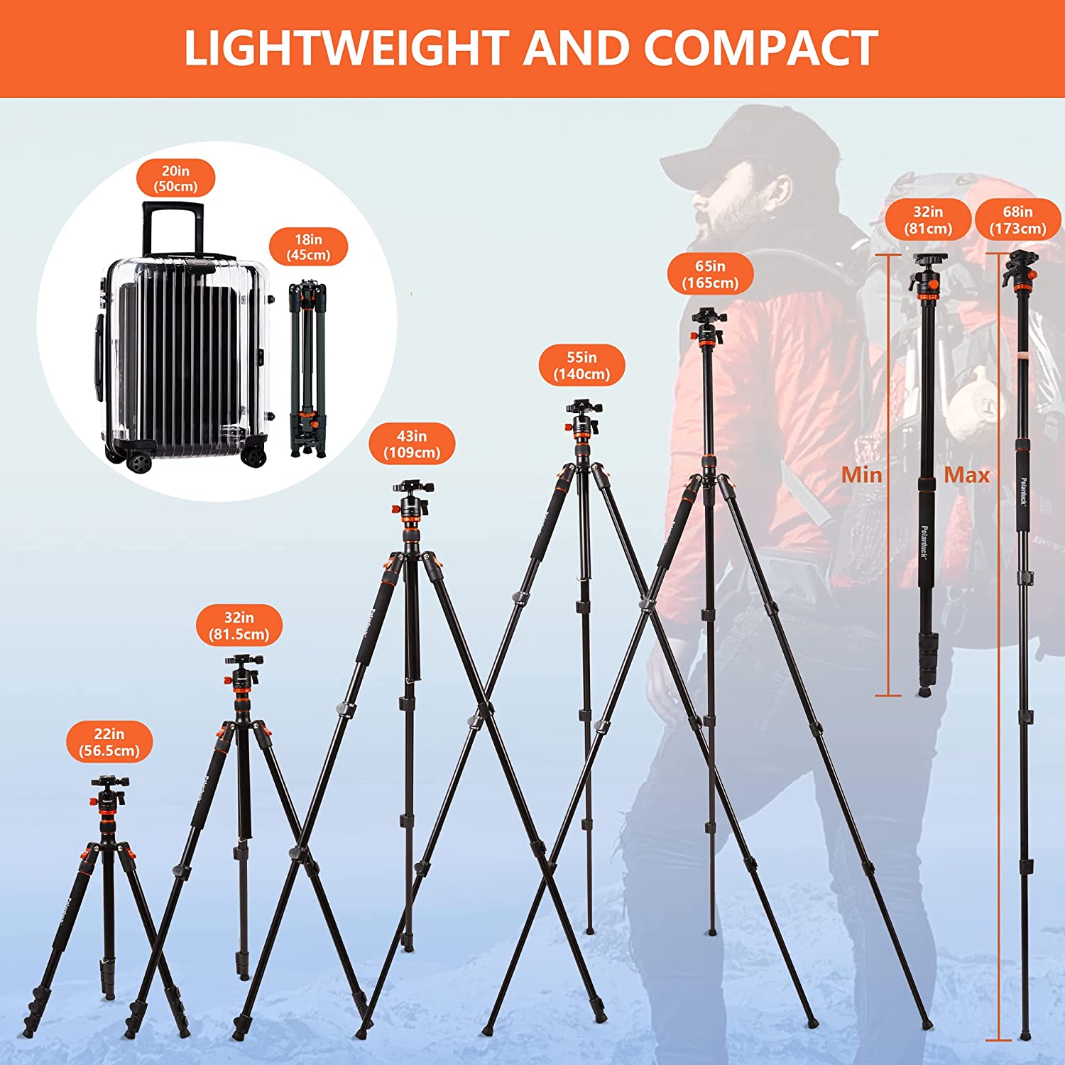 • HIGH-QUALITY and STURDY: Our camera tripod is made of supreme aluminum alloy and weigh only 3.1 lbs (1.4kg), lightweight but sturdy and the maximum load capacity is 22 lbs (10 kg). Also, the fully folded height is 18 inches (45cm), easy to carry with a travel bag.
