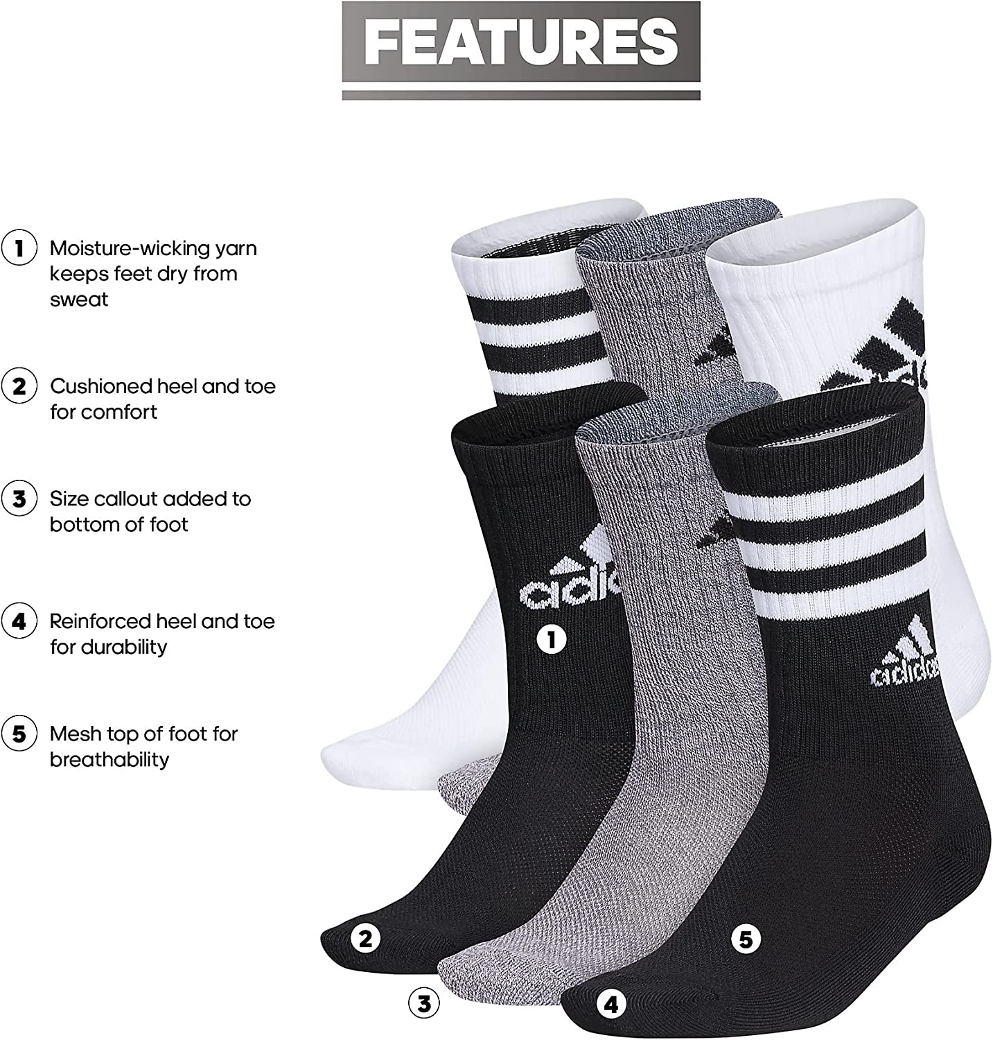 It's tennis lessons one day and wilderness camp the next. Kids are always trying new things, and these adidas crew-length socks let them mix up their look to match the day's adventure. Stretchy yarn wicks moisture to help keep feet dry. The pack includes six pairs in three different knit-in designs.