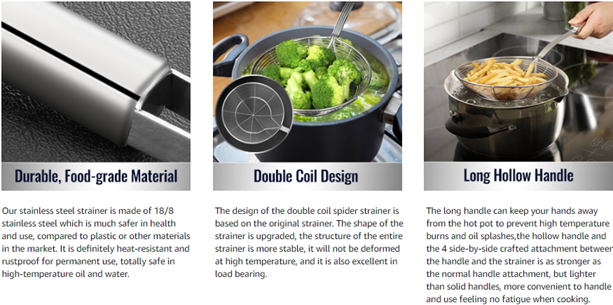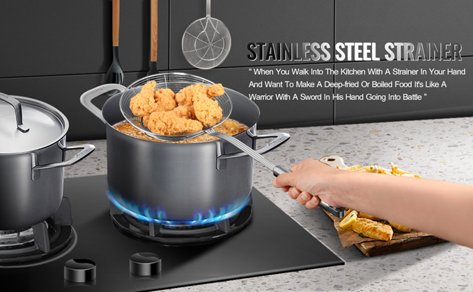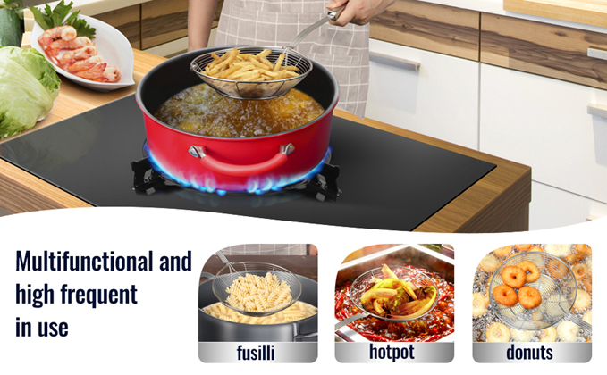 It will be widely used in the kitchen, and it is an essential item in the process of cooking and frying food in homes and restaurants, such as fish and chips, french fries, fried chicken, donuts, noodles, dumplings, boiled eggs, seafood, hot pot,etc.French fries, etc. It can even be used for cleaning vegetables and fruits, making salads, vegetarian foods, and soups. Its uses are diverse, waiting for you to discover.