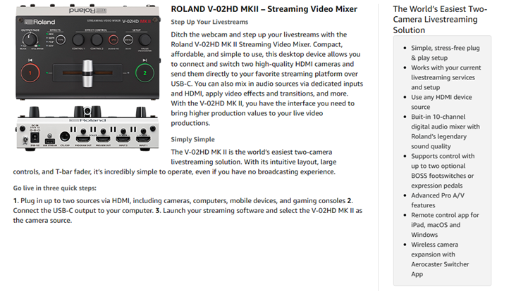 ROLAND V-02HD MKII – Streaming Video Mixer Step Up Your Livestreams Ditch the webcam and step up your livestreams with the Roland V-02HD MK II Streaming Video Mixer. Compact, affordable, and simple to use, this desktop device allows you to connect and switch two high-quality HDMI cameras and send them directly to your favorite streaming platform over USB-C. You can also mix in audio sources via dedicated inputs and HDMI, apply video effects and transitions, and more. With the V-02HD MK II, you have the interface you need to bring higher production values to your live video productions.