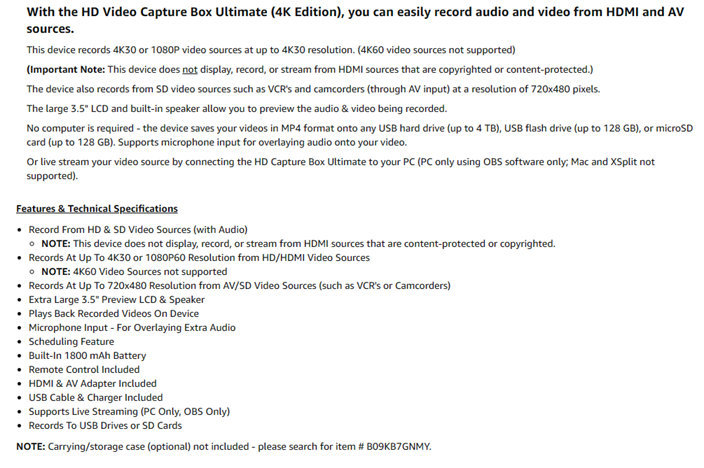 - IMPORTANT: Does NOT display, record, or live stream HDMI video sources that are copyrighted or content-protected. The device will show a black screen from these video sources. This device also does not support 4K60 (60 FPS) video input.