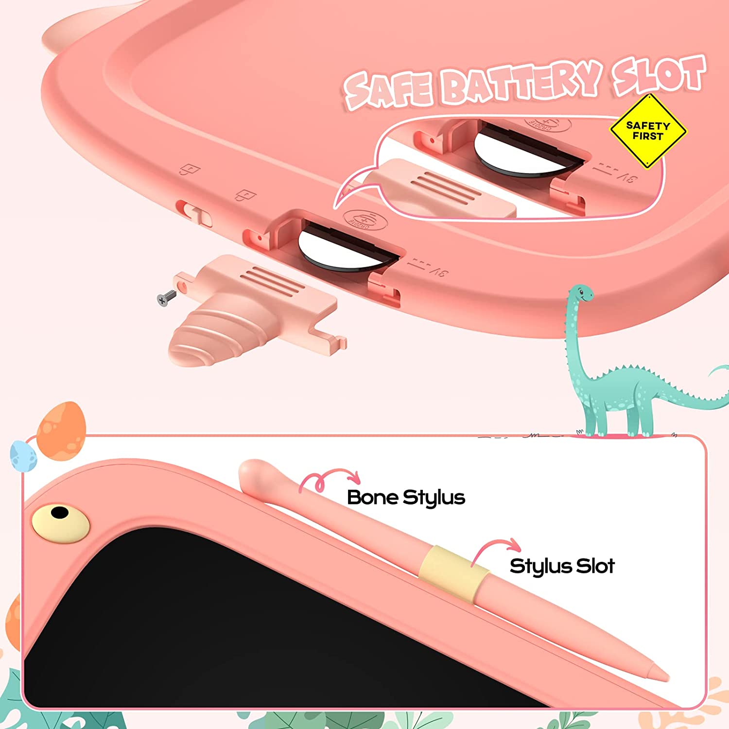【100% Safety & Happiness Guarantee】Safety is always the important point when choosing toys gifts for kids. The dinosaur LCD writing tablet is made of non-toxic ABS material. Anti-fall and waterproof screen. Screw to lock the battery slot. Kids can play with the drawing board safely.
