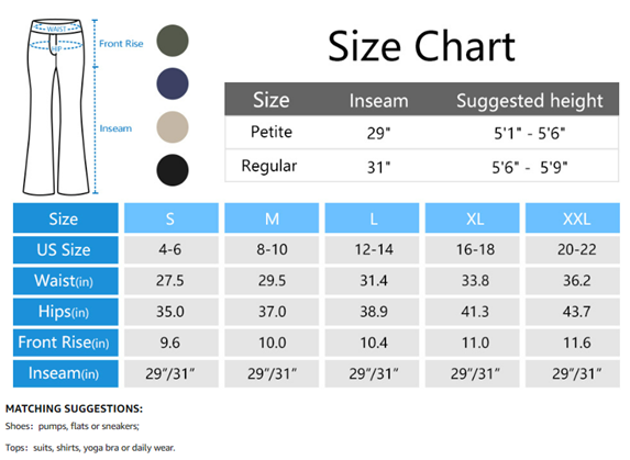 INSEAM LENGTHS: These business work pants feature with 2 different inseam lengths: Petite - 29" inseam fits women 5'1" - 5'6" / Regular - 31" inseam fits women 5'6" - 5'9". Please refer to the size chart shown in the last picture to choose the specific size of pants.
