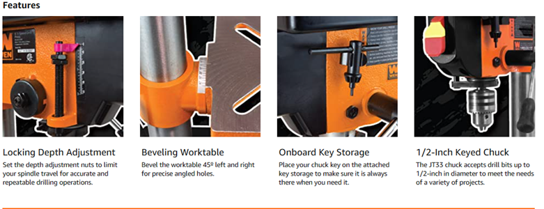 Remember when you could drill with maximum accuracy? Power through metal, wood, plastics, and more with the WEN 8-Inch 5-Speed Drill Press. Don’t let our compact design fool you. Between the five operating speeds, the two-inch spindle travel, and the sturdy construction, you’ll have way more precision than a standard handheld drill. Our 2.3-amp induction motor features ball bearings for smooth balanced performance even at high speed. Manually set your speed to either 740, 1100, 1530, 2100, or 3140 RPM by adjusting the belt position on the two spindles. The easy-to-read, locking depth stop allows for accurate and repeatable drilling operations. The keyed chuck with JT33 spindle taper accepts bits ranging from 1/20 to 1/2 inch in diameter (1.5 to 13 mm). The table bevels 45° left and right for angled drilling. The base is designed with holes for mounting onto a bench or work stand. Clamps and vises are easily mounted to the slotted table, making work-holding safe and effective. And because its a WEN product. a stocked inventory of replacement parts, and a helpful customer phone line. Remember when you could drill holes in almost anything? Remember WEN.