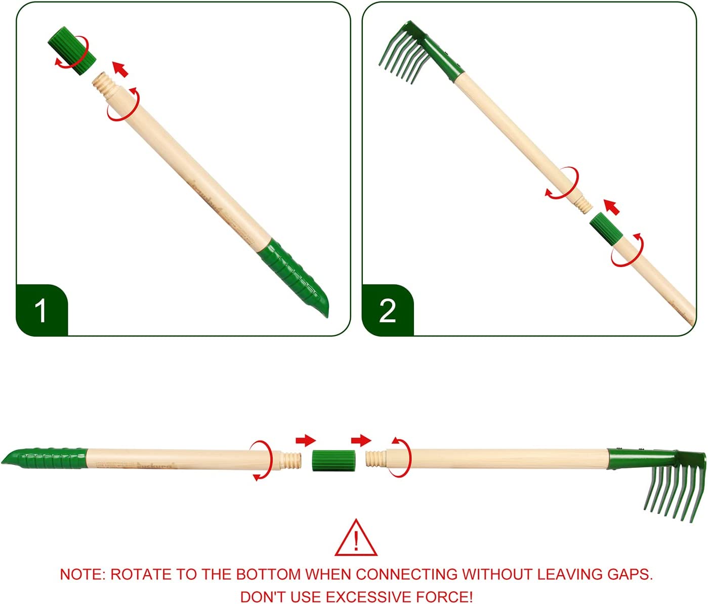 ERGONOMIC DESIGN FOR CHILDREN: The length of the children's gardening shovel set is 70cm(27.5in), which is a regular size suitable for most children. The handle is equipped with hanging holes and a middle connector that can be detached for easy suspension and storage. Note: the connector needs to rotate to the bottom without leaving gaps during use.