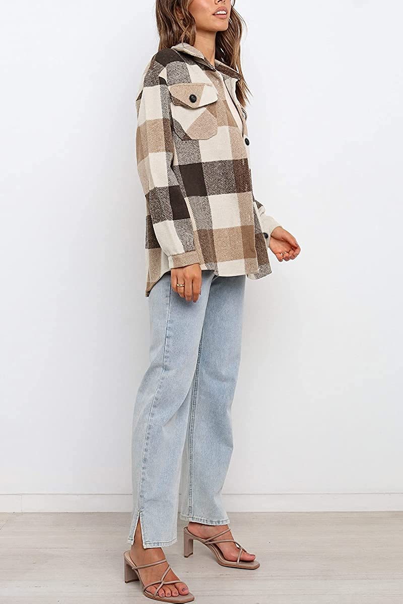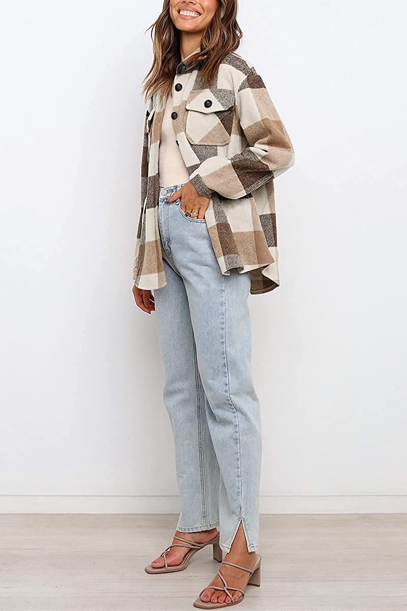 • ★Feature:It features soft fuzzy fabric, front button closure , and midweight feel for keeping warm all day. It'll be the prefect addition to your wardrobe.Two buttoned chest pockets / long sleeves with button cuffs / plaid pattern / loose fit shacket / collared.This shacket is a must have in your closet!