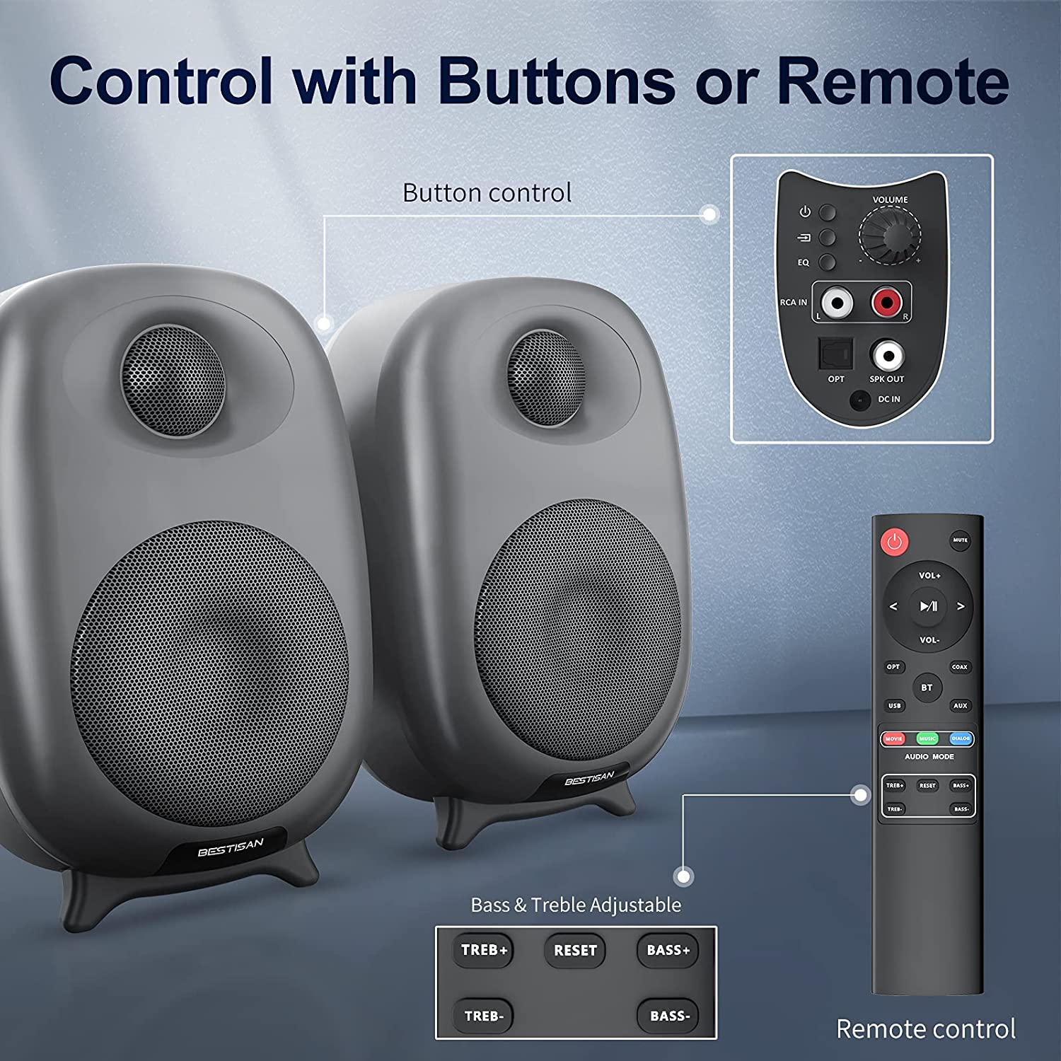 • Control your bookshelf speaker Remotely: handle your bookshelf speaker from the comfort of your couch or directly on the device; combine with bass & treble adjustable function to match your favorite sound.