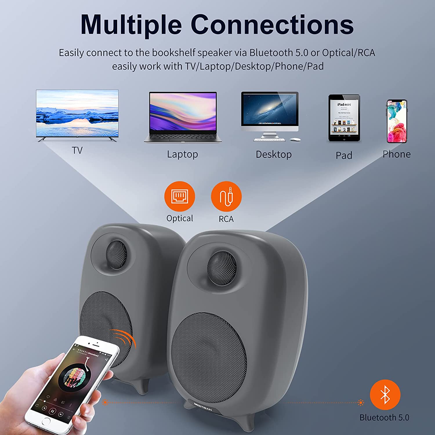 • Multiple wireless and wired connections: supports advanced Bluetooth 5.0 wireless connection, which you can easily connect with tablets, PC and other Bluetooth enabled devices to stream music; wired connection including optical, RCA inputs (all cables included).