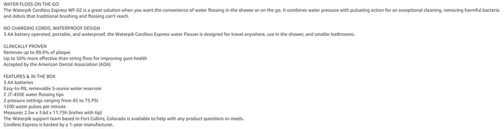 BATTERY OPERATED HANDHELD WATER FLOSSER: The Waterpik Cordless Express Water Flosser is powered by 3 AA batteries and is designed for travel anywhere, use in the shower, and small bathrooms.