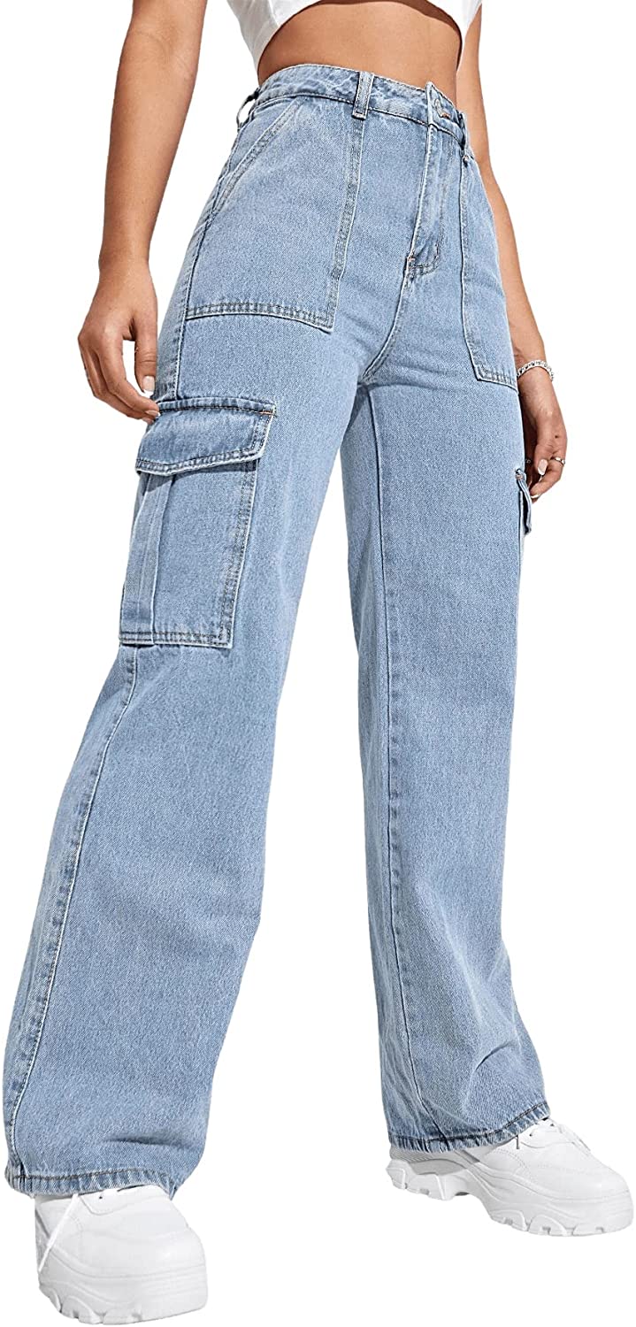 SweatyRocks Women's High Waist Cargo Jeans Flap Pocket Wide Leg Denim Pants/ Pattern Type: Plain/ Length: Long/ Type: Wide Leg, Cargo Pants/ Details: Pocket, Zipper, Button Front/ Fit Type: Loose/ Waist Line: High Waist/ Sheer: No/ Closure Type: Zipper Fly/ Fabric: Non-Stretch/