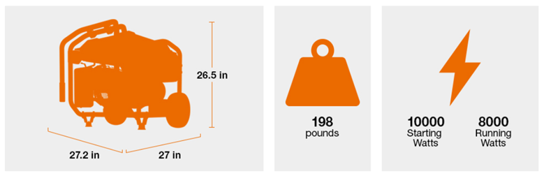 Generac’s GP8000E offers many benefits that make this model a favorite for emergency power or recreational use. Power Rush Advanced technology delivers over 30% more starting capacity* (*increase electrical current upon demand above rated output when starting electric motors), and electric start makes the GP8000E easy to use (battery included). You’ll always be prepared with the plug-in battery jack that keeps the battery charged and ready for unexpected outages. The long-lasting OHV engine and large-capacity steel fuel tank with fuel gauge provide increased durability and up to an 11-hour runtime at 50% load. Rough or rugged environments will not be an issue thanks to the covered outlets for added protection, heavy-duty wheels that will never go flat and a fold-down handle that will enable you to easily transport your generator to any location. The low-oil feature will automatically shut down the generator, preventing damage to the unit, while the hardened 1. 25-in. Steel-tube cradle increases strength and resilience. And with the regular maintenance alerts provided by your hour meter, you’ll never be caught off guard.