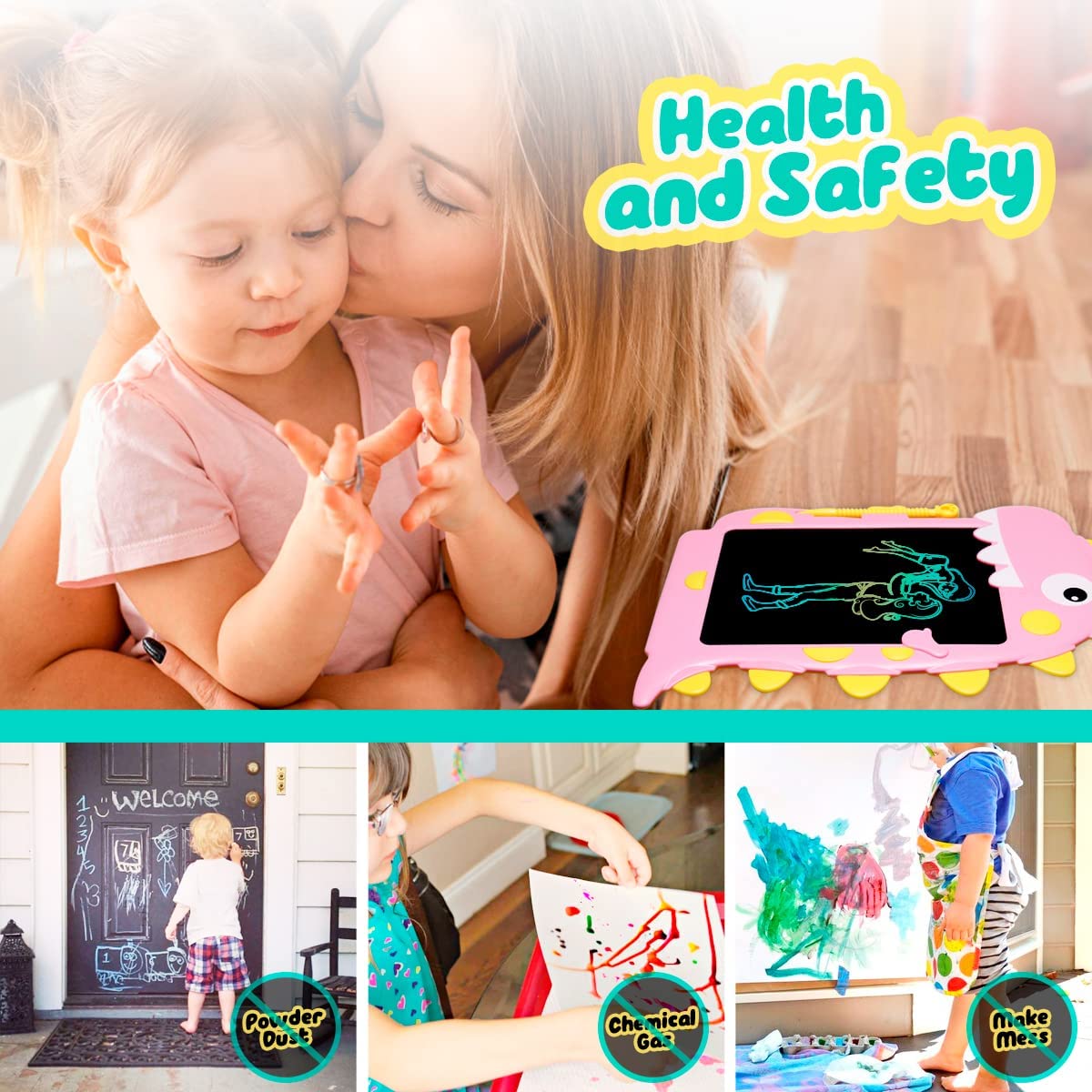 ?【Eye Protection & Safe 】The writing tablet features the latest LCD flexible screen, no blue light, radiation-free,protects the eyes and keeps your child away from chemical pigments and dust that can irritate the skin and lungs.