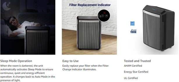 - Activated Carbon Filter: Reduces VOCs and household odors from cooking, pets, and smoke. It is designed to catch airborne particles found indoors, which also helps prolong the True HEPA Filter life