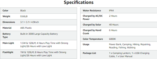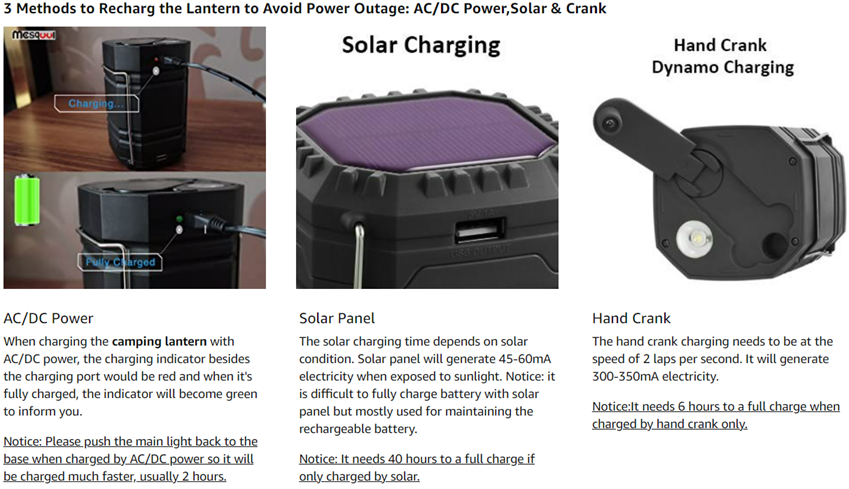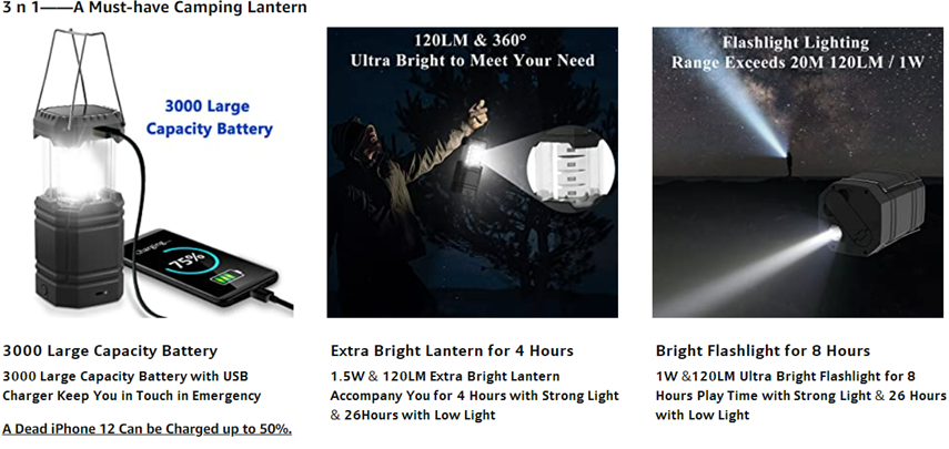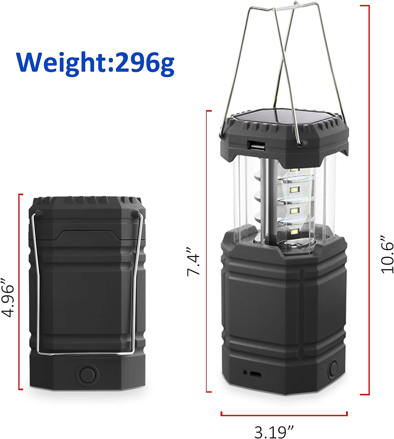 -Extra Long Play Time-The main lantern light can be continuously illuminated for no less than 22 hours and the flashlight is for 20 hours when fully charged.